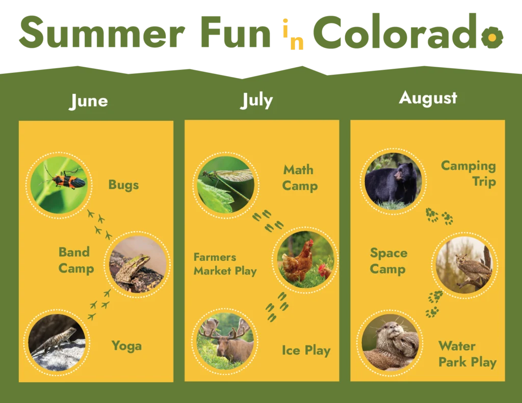 Calling all little explorers! Join us this summer for outdoor nature and sensory adventures made just for kids ages 18 months to 8 years. Each week brings a new theme full of hands-on fun — like bugs, frogs, yoga, math, farming, camping, and even space travel! We’ll meet friendly “Feature Creatures” like River Otters, Blue-Belly Lizards, and Great Horned Owls along the way. Come play, splash, dig, and discover the magic of nature with us — and make some amazing memories under the Colorado sun!